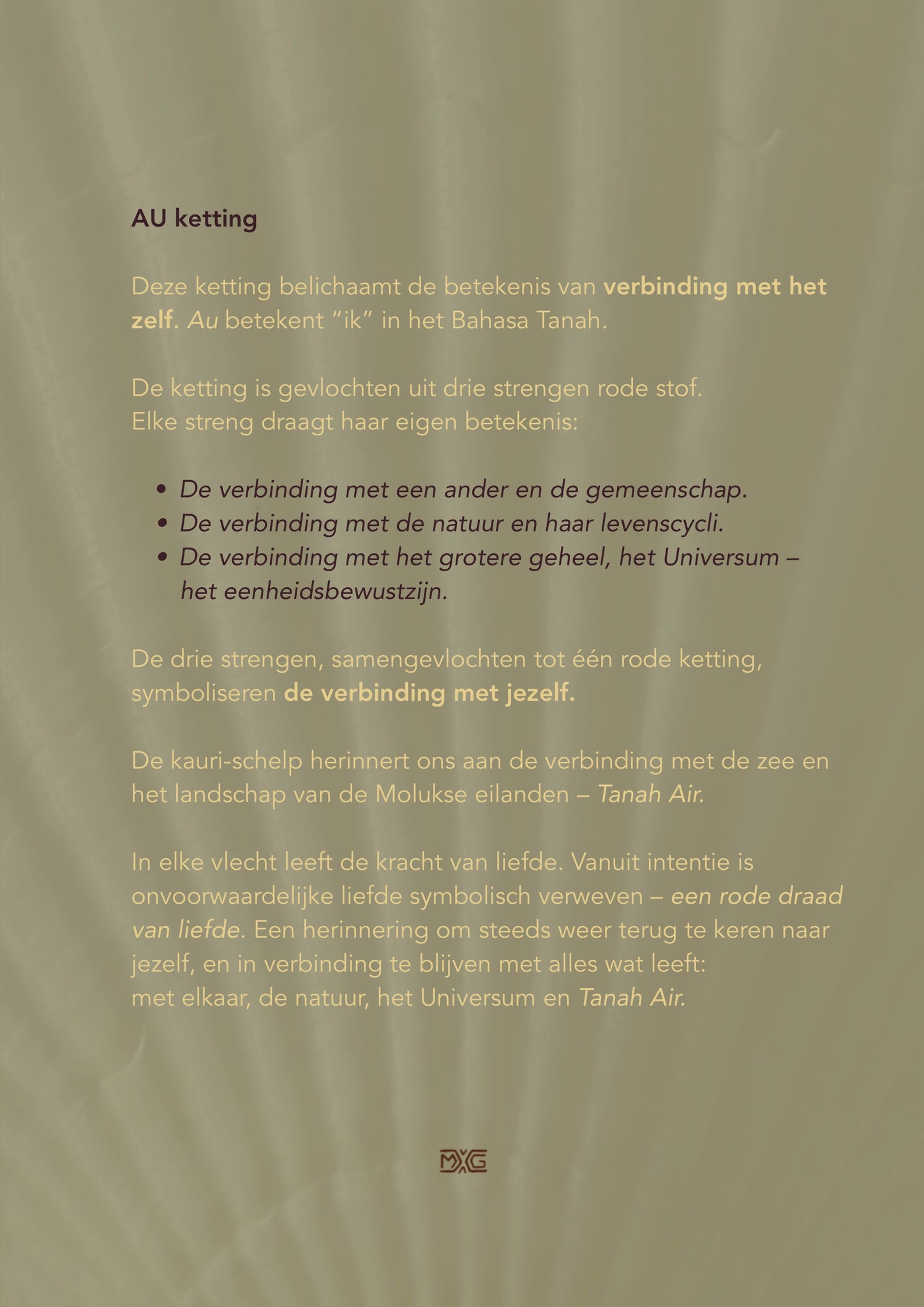 Deze ketting is met liefdevolle intentie vervaardigd, met het idee dat zij haar betekenis mag blijven dragen wanneer zij van generatie op generatie wordt doorgegeven.